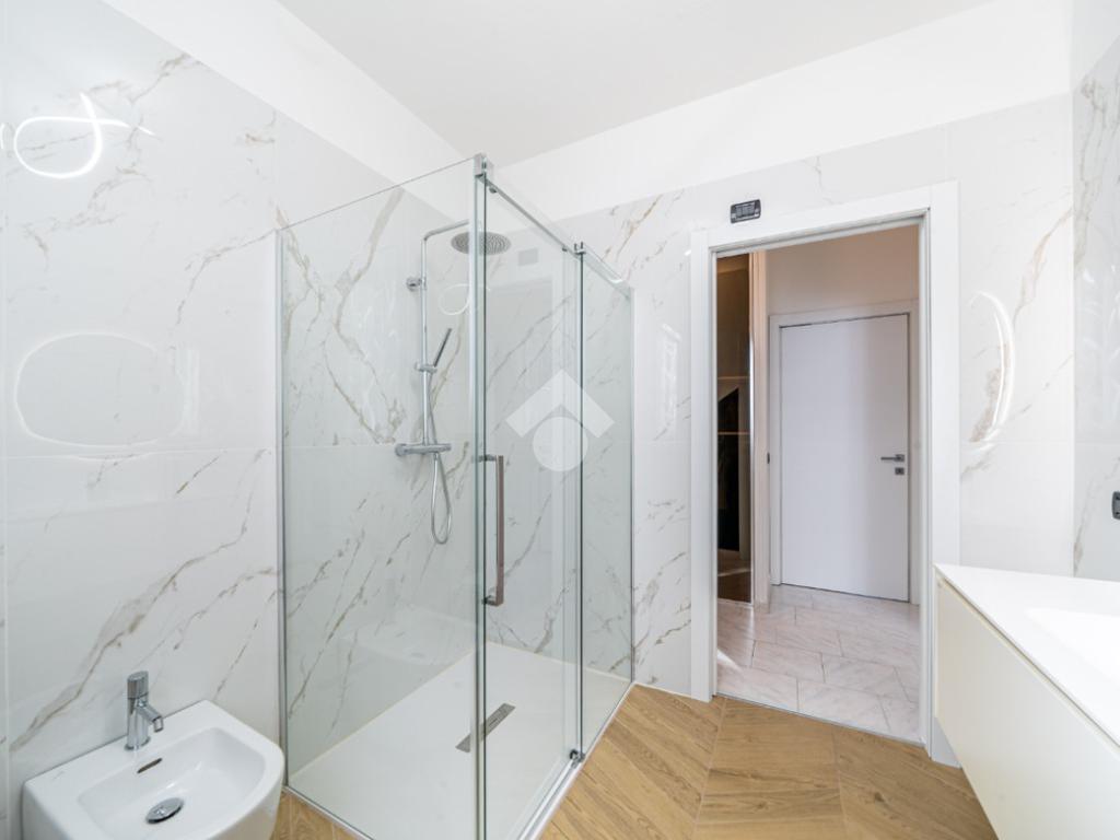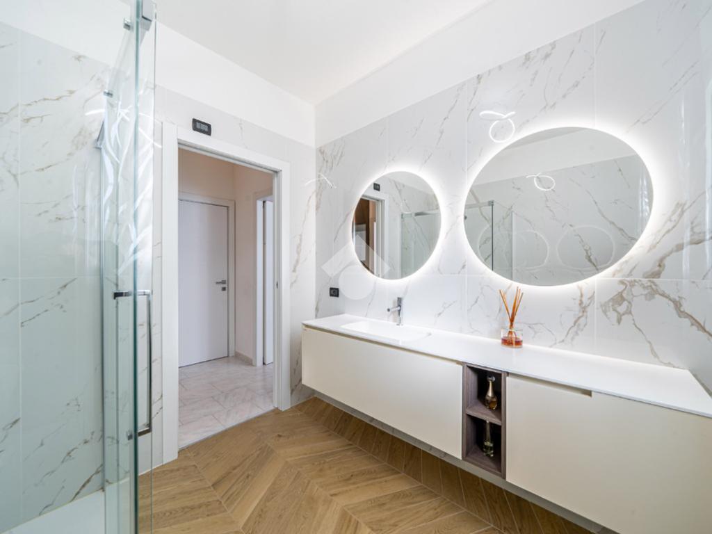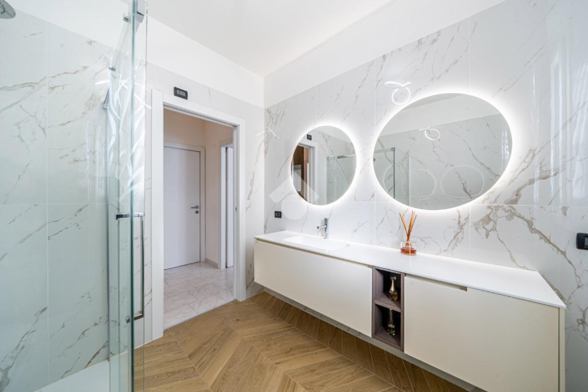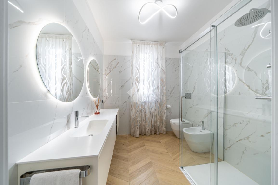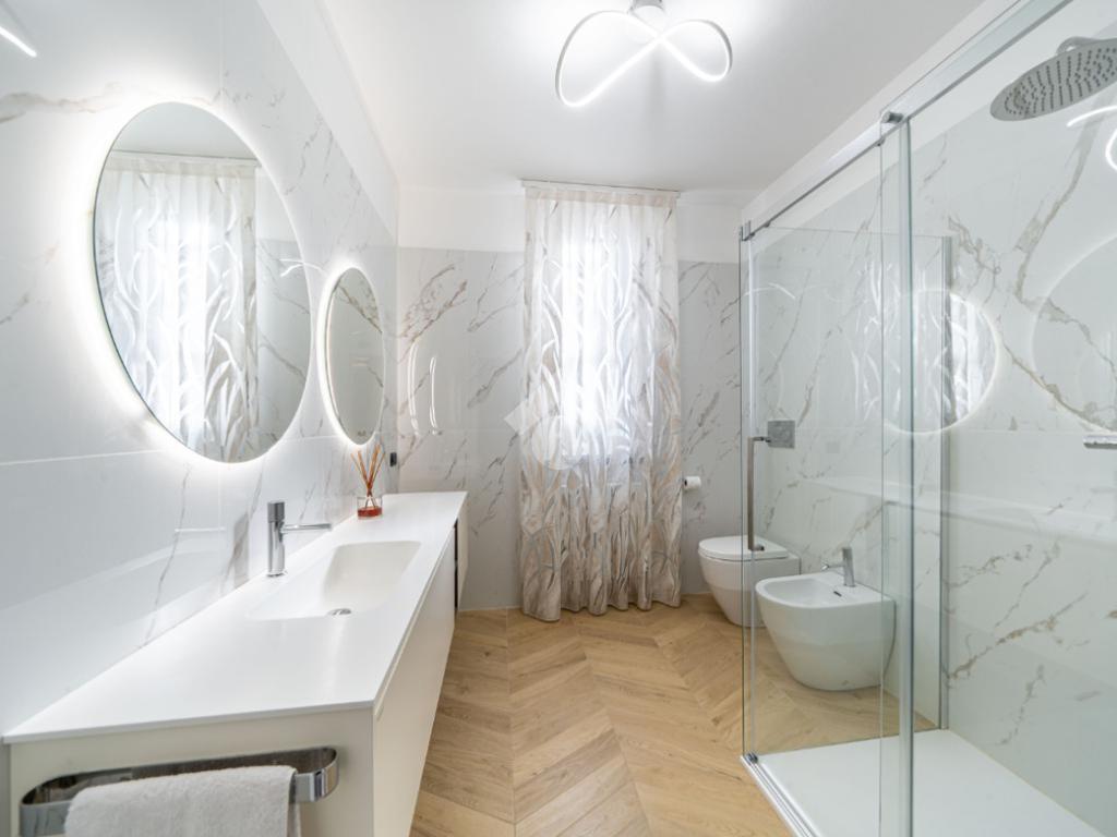 Dal corridoio entriamo nel reparto notte con la classica disposizone: bagno centrale moderno con doccia doppia e due camere da letto ai lati, entrambe matrimoniali.