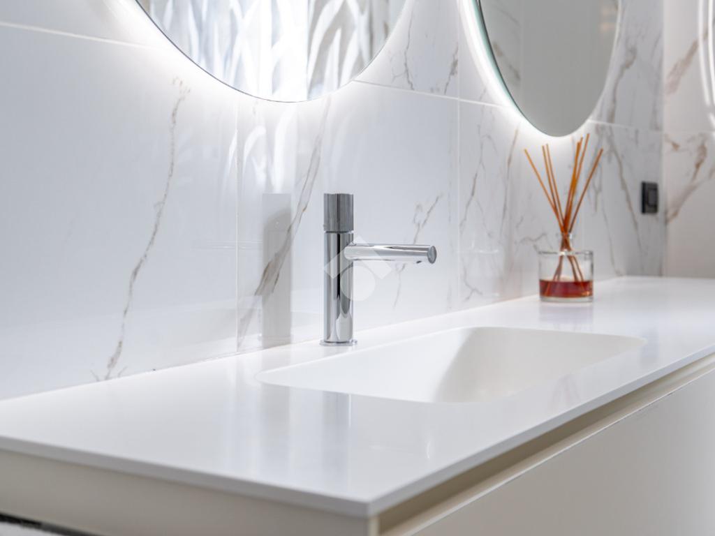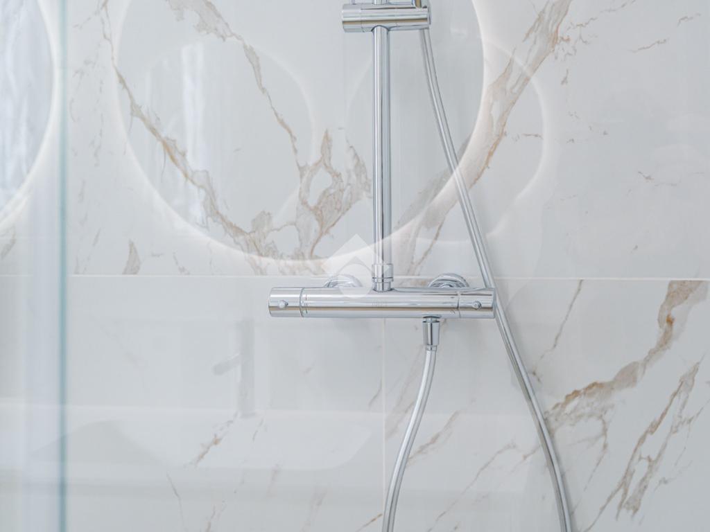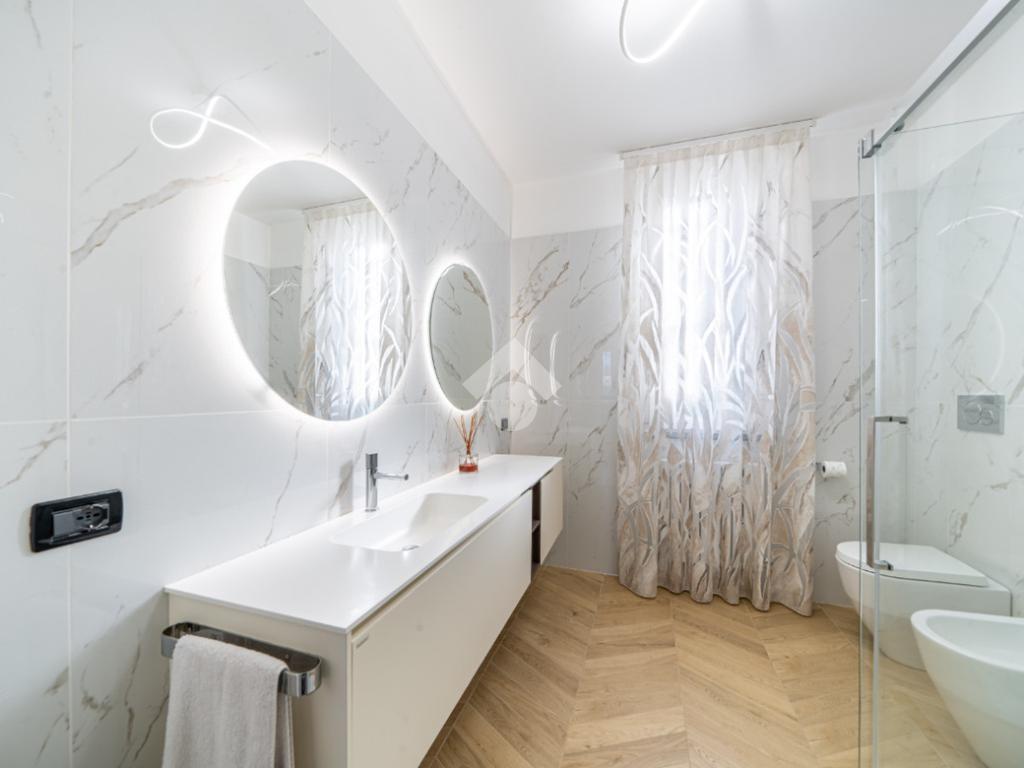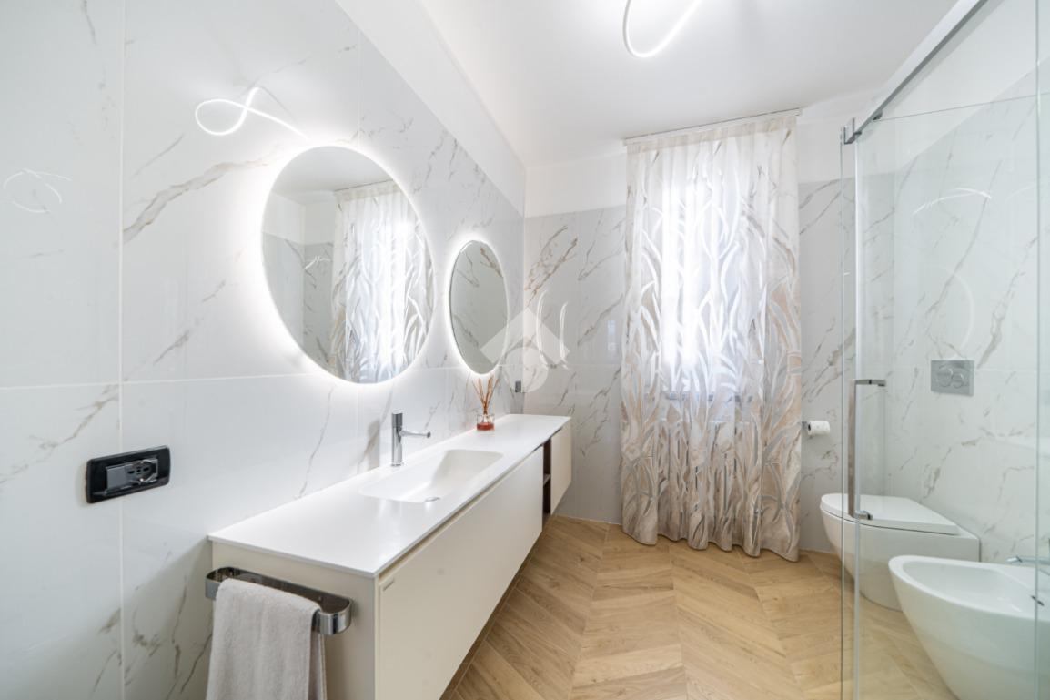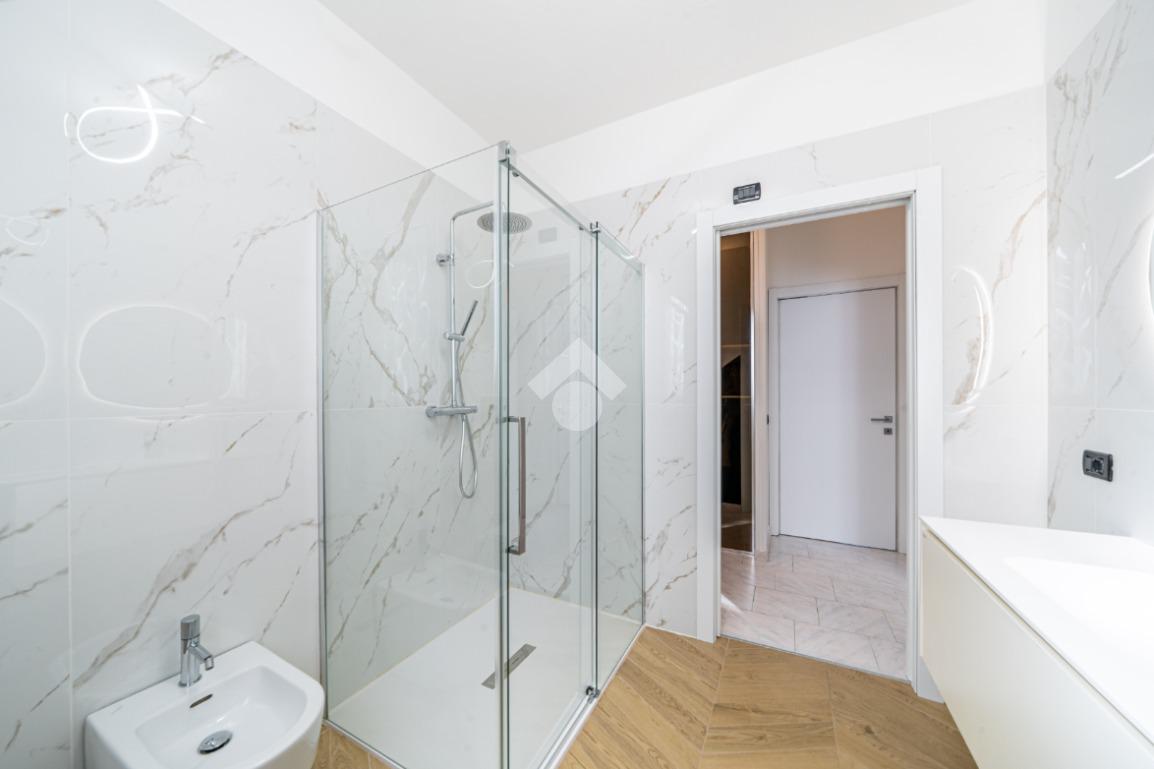 Dal corridoio entriamo nel reparto notte con la classica disposizone: bagno centrale moderno con doccia doppia e due camere da letto ai lati, entrambe matrimoniali.